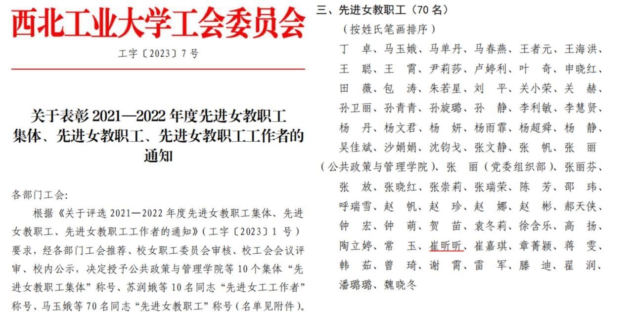 崔昕昕老师当选学校2021-2022年度先进女教职工。