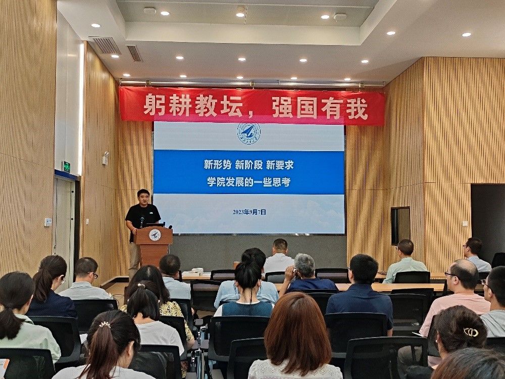常务副院长邱强以“新形势、新阶段、新要求,学院发展的一些思考”为题作工作报告。重点传达了学校2023年暑期工作研讨会暨新学期干部大会的会议精神,对照学校“127”目标,分析了学院的优势特色和短板弱项,并对学院新学期的重点工作进行了安排部署。他强调,要充分调动一切积极因素和积极力量,对标关键指标,在人才培养、科学研究、人才队伍、社会服务、国际合作等方面深化细化具体的举措办法,全力推进学院各项事业的高质量发展。