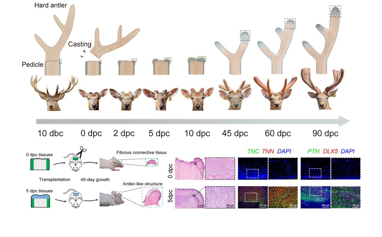 此次入选的“揭示鹿茸再生发育的细胞和分子机制”研究成果,是学院在农业科技领域的一次重大突破。鹿茸作为哺乳动物中唯一可完全再生的器官,其再生机制的研究对于推动再生医学领域的发展具有重要意义。研究团队通过多组学测序技术,成功构建了鹿茸再生的细胞图谱,揭示了鹿茸再生过程中细胞类型、分布及其动态变化的奥秘。此外,还鉴定出了一类全新的关键间充质干细胞,这类细胞具备极强的自我更新能力和高效分化为软骨和骨细胞的能力,展现出惊人的骨骼修复能力。这一发现不仅深化了我们对哺乳动物器官再生机制的理解,更为鹿茸产业的可持续发展和再生医学领域的研究开辟了新的方向。