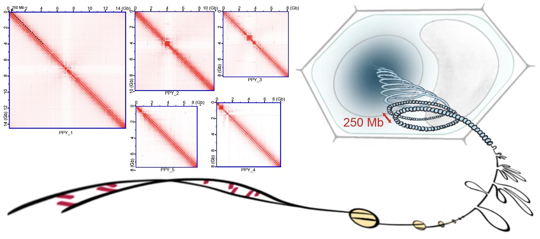 面对超大基因组组装的世界性难题,研究团队创新研发染色体组装策略(已获国家专利ZL202410969593.6),成功绘制出滇重楼五条巨型染色体图谱。通过Hi-C数据分析,研究团队首次发现这些"巨无霸"染色体在细胞两次分裂间的休息期(细胞分裂间期)仍保持独特的高阶螺旋结构,每圈螺旋长达250 Mb,颠覆了传统认知。